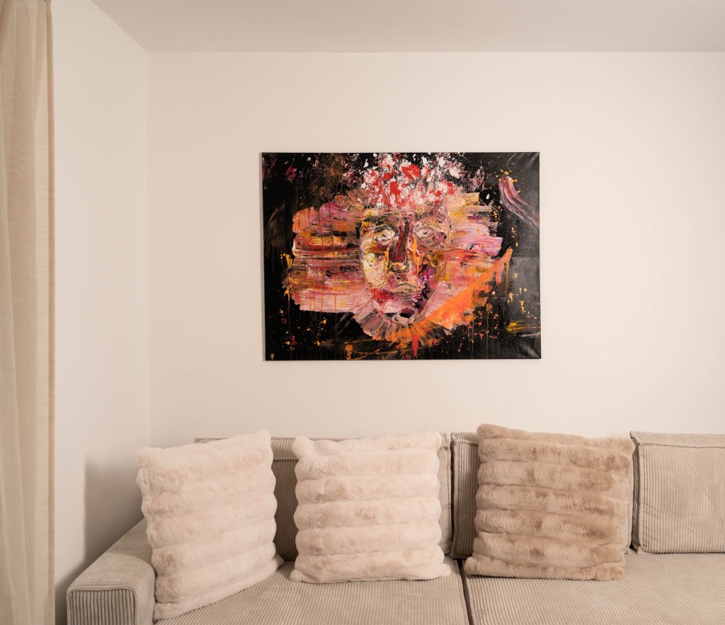 This painting is more than a visual piece; it’s an emotional experience. It speaks to the inner battles we all face, where vulnerability meets strength and chaos gives way to transformation. As you observe it, you may feel the subject both dissolving into and emerging from the colors—symbolizing the duality of destruction and rebirth.